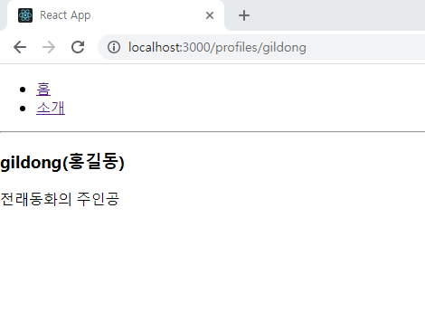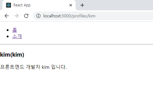 /profiles/kim과 /profile/gildong 경로로 직접 들어가보면 Profile 컴포넌트에서 입력한 데이터가 나타날 것이다.